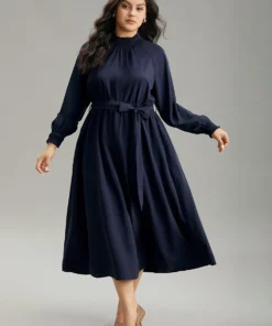Anti-Wrinkle Plain Shirred Mock Neck Belted Dress