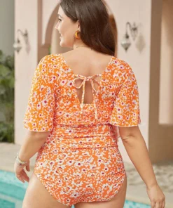 Floral Crossover Front Flutter Scoop Neck Tankini Top