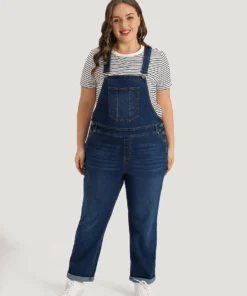 Solid Adjustable Straps Pocket Roll Hem Denim Overalls