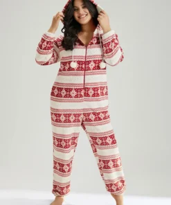 Snowflake Print Fuzzy Trim Sleep Hooded Jumpsuit