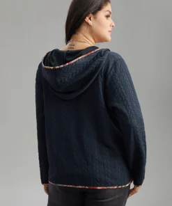 Textured Contrast Zipper Hooded Drawstring Sweatshirt