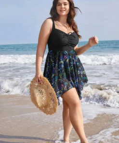 Tropical Ruched Ties Hanky Hem Crisscross Swim Dress