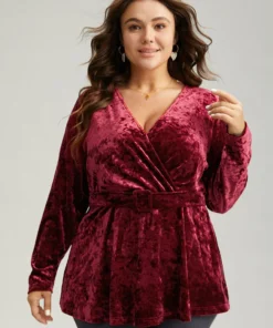 Velvet Overlap Collar Elastic Waist Buckle Detail Blouse
