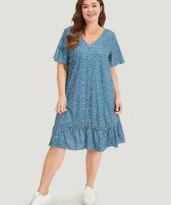Water Drop Print Button Detail Ruffled Dress