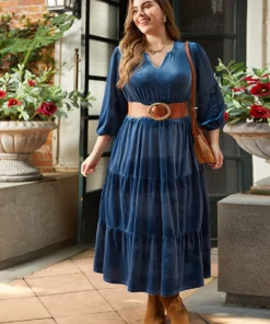 Velvet Solid Notched Shirred Tiered Hem Dress