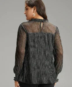 Stand Collar Mesh Patchwork Frill Trim Blouse