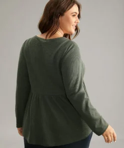 Plain Round Neck Waffle Knit Gathered T-shirt