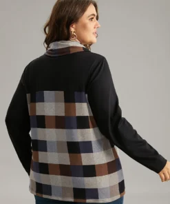 Plaid Patchwork Contrast Cowl Neck T-shirt