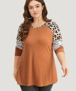 Striped Patchwork Leopard Print Crew Neck T-shirt